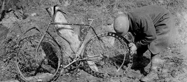 Англичане осматривают разбитый и брошенный немецкий велосипед на безрезиновых шинах.